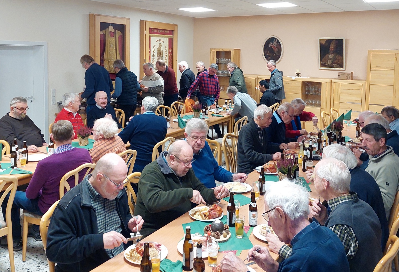 Am Freitag, den 28. November, konnte dieser Wunsch umgesetzt werden: Gisela Pauls und ihr Team des Kirchenchors organisierten erneut einen gemeinsamen Abend im Pfarrheim. Insgesamt 36 Männer nahmen teil. Für das leibliche Wohl sorgte die Fleischerei Klare mit Eisbein oder Leberkäse und Sauerkraut, dazu wurden verschiedene Getränke angeboten. In freundlicher Atmosphäre wurden Erinnerungen ausgetauscht und aktuelle Themen aus dem Dorfleben besprochen.