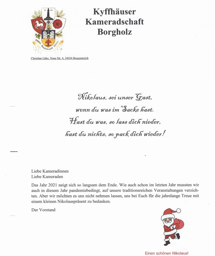 Die Kyffhäuser-Kameradschaft Borgholz hat sich in diesem Jahr etwas besonderes einfallen lassen. Zum Nikolaustag werden an alle Mitglieder Nikolaustüten verteilt.