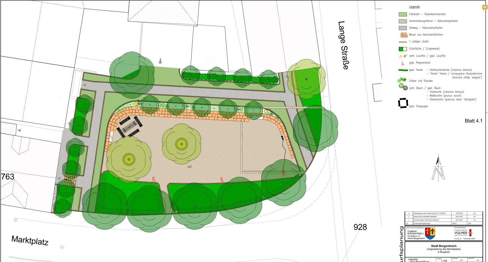 Die Orgelstadt Borgentreich hat dem Ing. Büro Volmer den Auftrag erteilt, einen Entwurf zu erarbeitet. Hierbei steht für alle das Planungsziel einer ortgerechten Gestaltung des Platzes im Vordergrund. Ferner muss die Gestaltung der topografischen Lage gerecht werden, sowie den Gesetzen und Rechtsverordnungen als auch dem aktuellen Stand der Technik entsprechen. Darüber hinaus wurde auch ein Kostenrahmen für die Maßnahme gesetzt, welcher einzuhalten war.